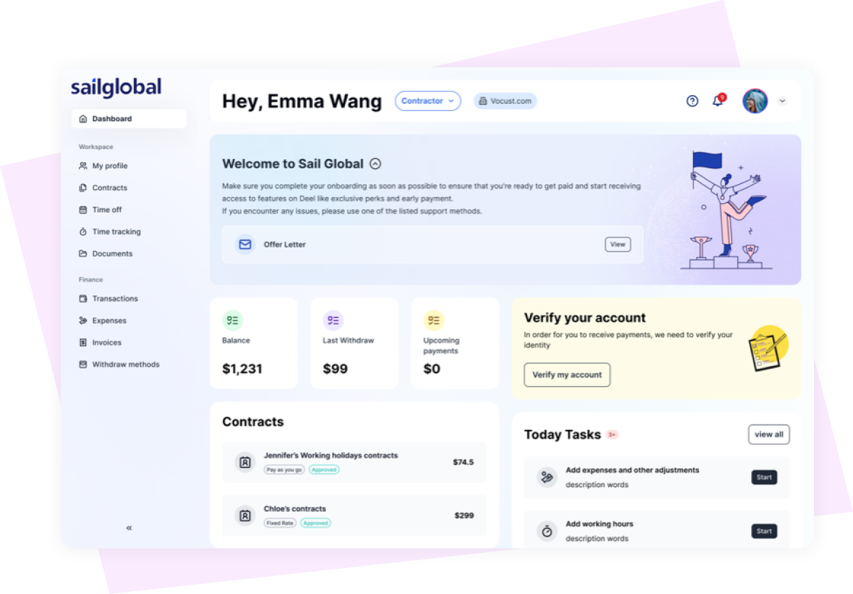 Your overseas business is expanding—don't let borders hold you back. SailGlobal enables easy global hiring and management of talent, letting you focus on growth.